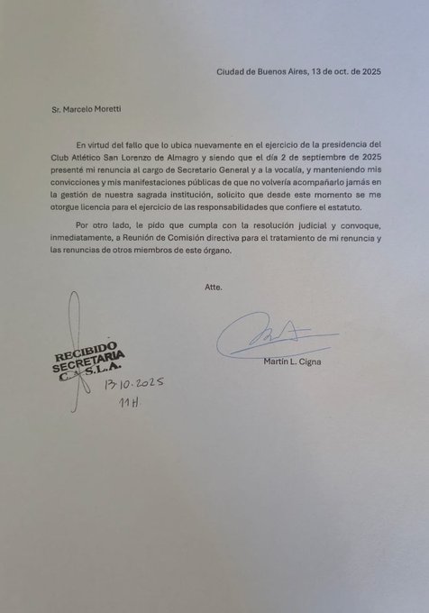 Cigna, quien fue uno de los hombres de mayor confianza de Moretti durante la campaña y los primeros meses de gestión, había renunciado a la Comisión Directiva el pasado 2 de septiembre, tanto a su cargo de secretario como a la vocalía. Sin embargo, tras el fallo judicial que permitió la restitución del presidente, su renuncia quedó sin efecto y volvió a ocupar su lugar en el organigrama dirigencial.