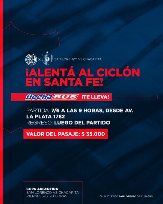 Este martes, el Ciclón anunció que Flecha Bus, la empresa que patrocina al club, llegó a un acuerdo para poner micros que vayan ida y vuelta desde la sede de Avenida La Plata. La salida será el mismo viernes a las 9 de la mañana y el regreso una vez finalizado el partido frente al Funebrero.