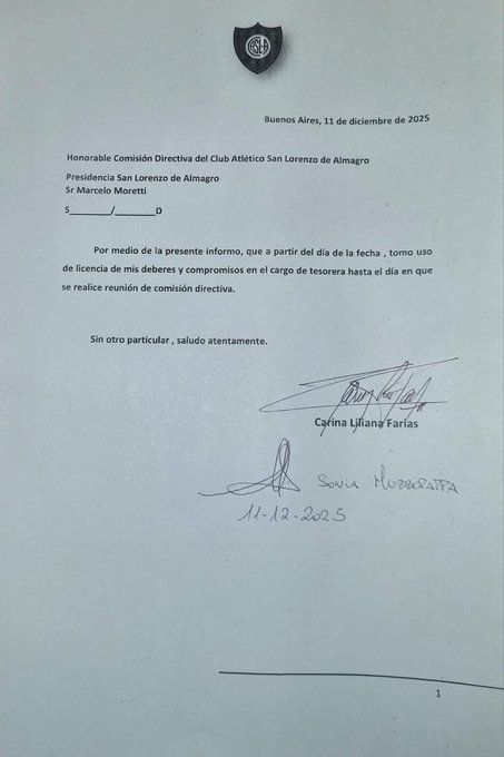 Farías había quedado a cargo del área desde el regreso de Marcelo Moretti al club vía un fallo judicial. En ese momento, la había designado para garantizar el funcionamiento mínimo de San Lorenzo: pagos operativos, firmas, contratos y erogaciones diarias. Con su licencia, el club literalmente se queda sin firma autorizada, lo que agrava la parálisis institucional.